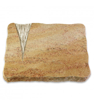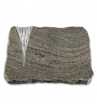 Hochwertig gefertigte Grabplatte im Design "Delta" aus Naturstein Juparana inkl. persönlicher Inschrift in hochwertiger Sandstrahlgravur. Wahlweise mit Metall-Ornament.
