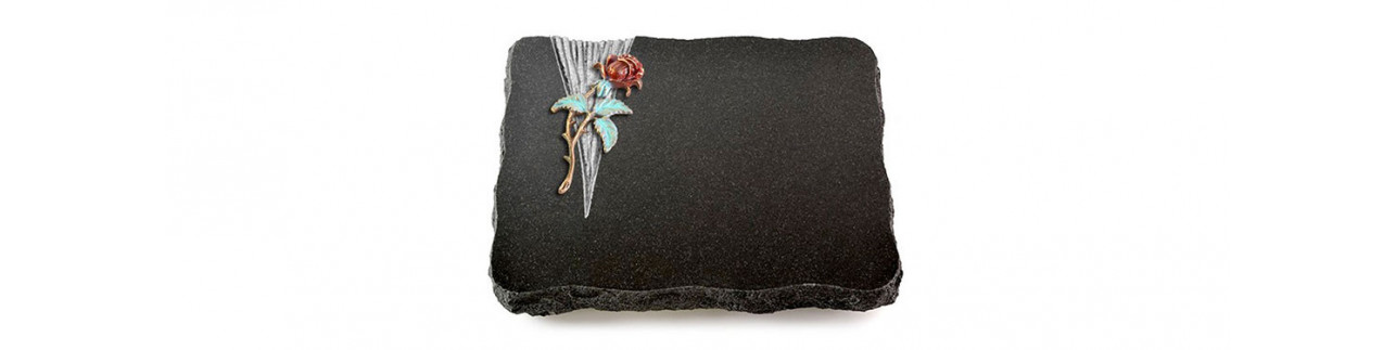Hochwertig gefertigte Grabplatte im Design "Delta" aus Naturstein Aruba inkl. persönlicher Inschrift in hochwertiger Sandstrahlgravur. Wahlweise mit Metall-Ornament.